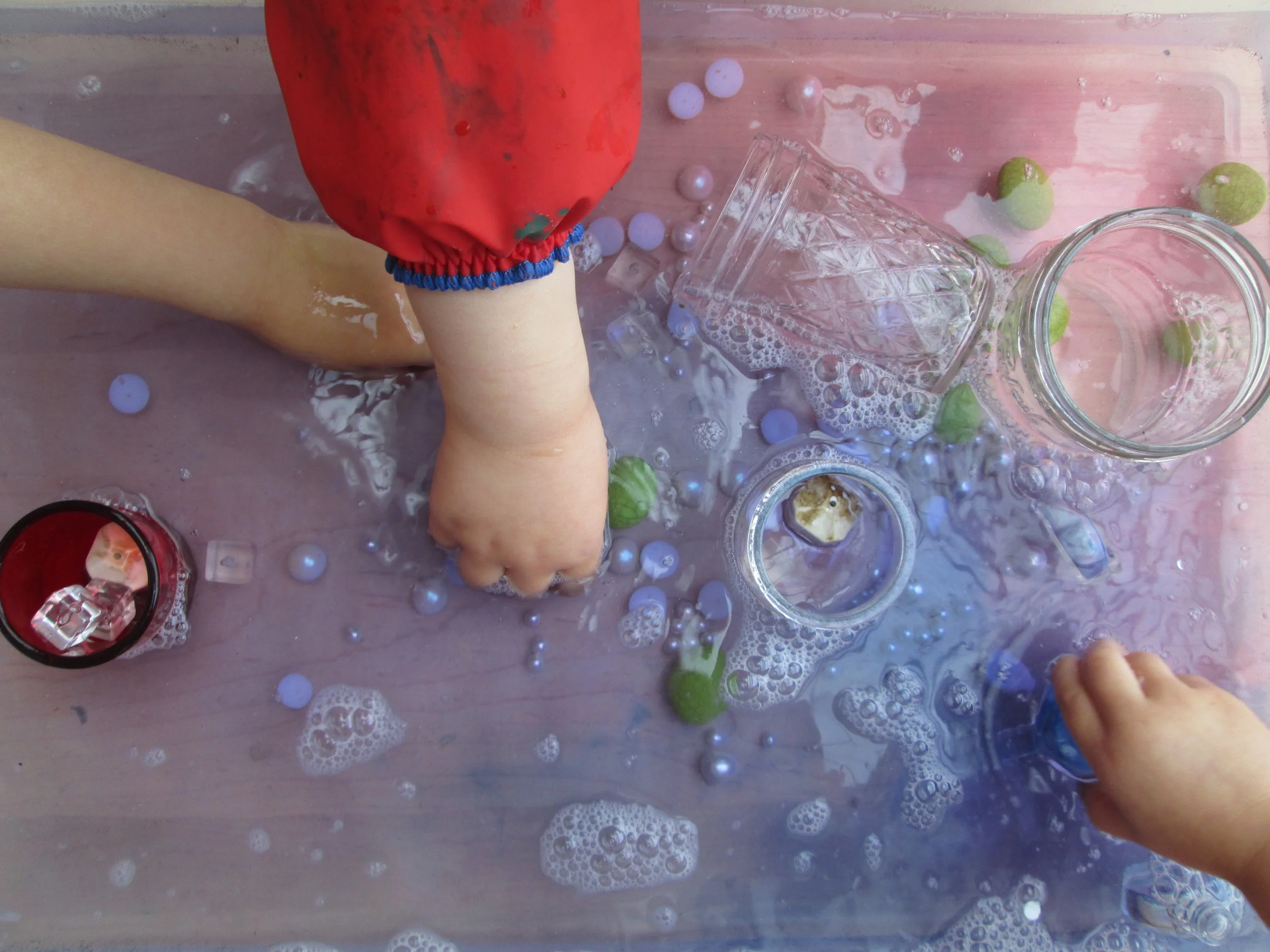 2s explore a water table full of found materials and a variety of liquid watercolor shades.